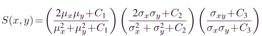 其中,$μ_x$、$μ_y$、$σ_x$、$σ_y$和$σ_{xy}$分别是真实图像x和生成图像y的统计特征(均值、方差),$C_1=(0.01V)^2$、$C_2=(0.03V)^2$和$C_3=0.5C_2$,其中$V$是像素值。SSIM值越大表示两个图像之间的相似度越高。