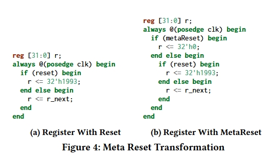 在这项工作中,我们通过对电路的中间表示(IR)进行转换来实现解决方案 2,并添加了一条 MetaReset 线,将电路中的所有寄存器重置为零。图 4 举例说明了在 Verilog 的寄存器描述中添加 MetaReset 的过程。因此,我们的测试线束在每次测试前都会应用以下序列: